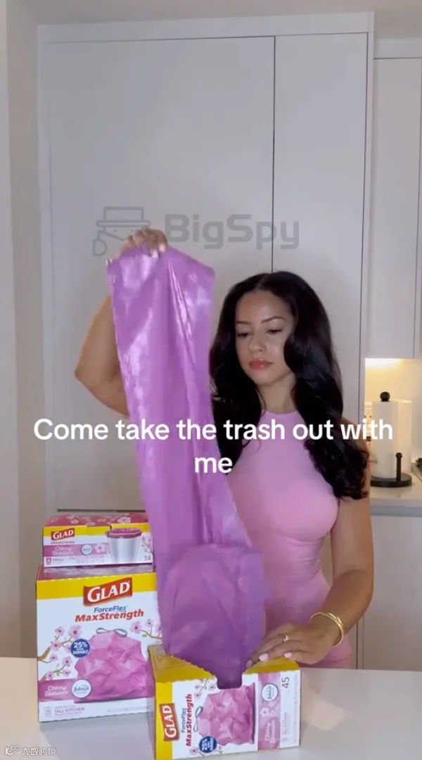 Glad垃圾袋的广告开头是一个穿着时尚、身材火辣的女士在厨房更换垃圾袋,接着外出丢垃圾。女士的连衣裙和垃圾袋都是粉色,垃圾袋拎在手上仿佛一件时尚单品。在熟悉的场景中加入罕见元素,增加新鲜感,给人留下深刻的印象。