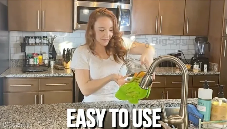 这是一条非常标准的沥水挡板销售广告,卖点清晰,配合真实使用场景,预设了用户提问并给出了回答。清洗水果时,把沥水挡板卡在碗沿后倒水,字幕显示“使用方式简单”;把沥水挡板放进洗碗机,字幕显示“便于清洁”;用沥水挡板夹在锅边沥煮意面的水,字幕显示“可承受230°高温”。