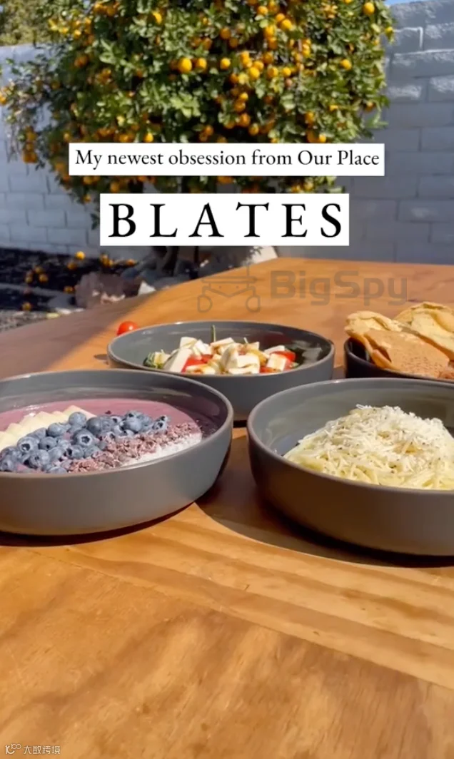 视频开头是一桌精致的食物,用4个同样的盘子盛装;接着介绍这个盘子的优势:既可当碗也可以当盘子,手工上釉,可用于烤箱、洗碗机、冰箱冷冻,每个优势点对应有具体的画面。这则广告来自Our Place,投放当天即在美国获得了超过190万展现量。