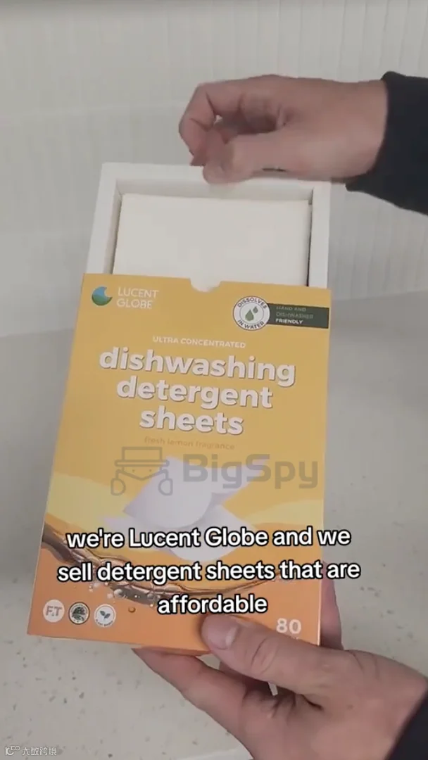 这时Lucent Globe产品出现,配合把洗碗片放进洗碗机和水槽的动作,字幕显示,我们品牌推出了一款你绝对能买得起的洗碗片,不含塑料和有害化学物质,使用成本低。与前面的产品形成强烈的好坏对比。