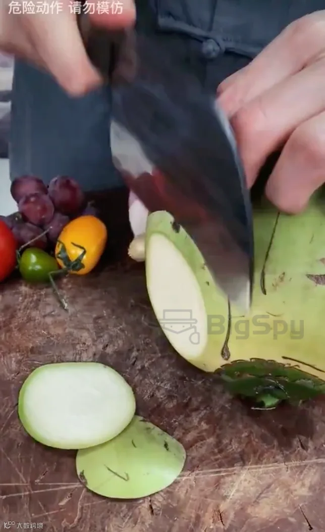 真正的刀具广告,视频中用刀切了5种软硬、质地不同的食材,包括椰子、玉米和番茄等,非常干脆利落;切完把刀扎在布满使用痕迹的砧板上,一套动作行云流水,表明这是厨房经验人士的推荐。