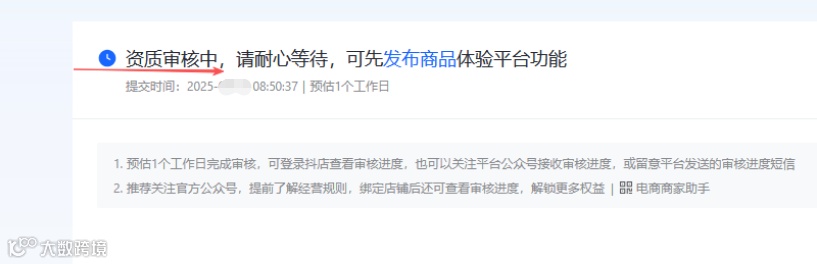 提交后系统先进行自动审核(约 3-5 分钟),审核结果会通过短信 + 抖音 APP 消息通知