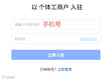 第二步:选择主体类型(个体/企业/个人),然后填写手机号、收验证码,然后点【立即入驻】