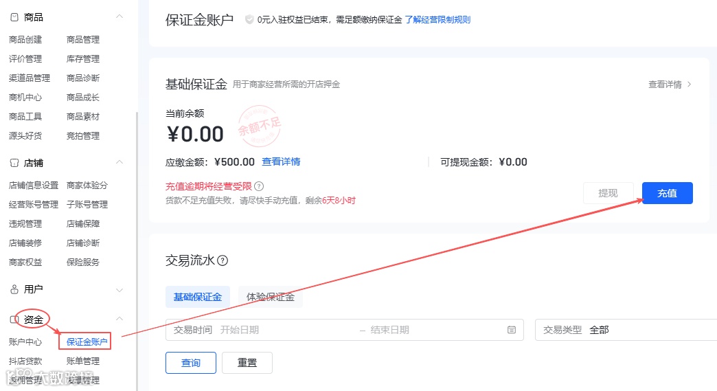 2、缴纳店铺保证金:在抖店后台的【资产-保证金账户】页面,新开店铺初始保证金是500元。