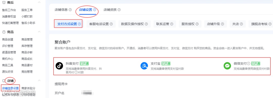3、开通支付方式:在抖店后台的【店铺-店铺信息设置】页面,选择【店铺设置-支付方式设置】