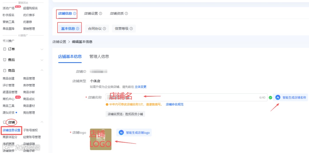 1、上传店铺LOGO,可以自己作图,也可以通过AI自动生成。