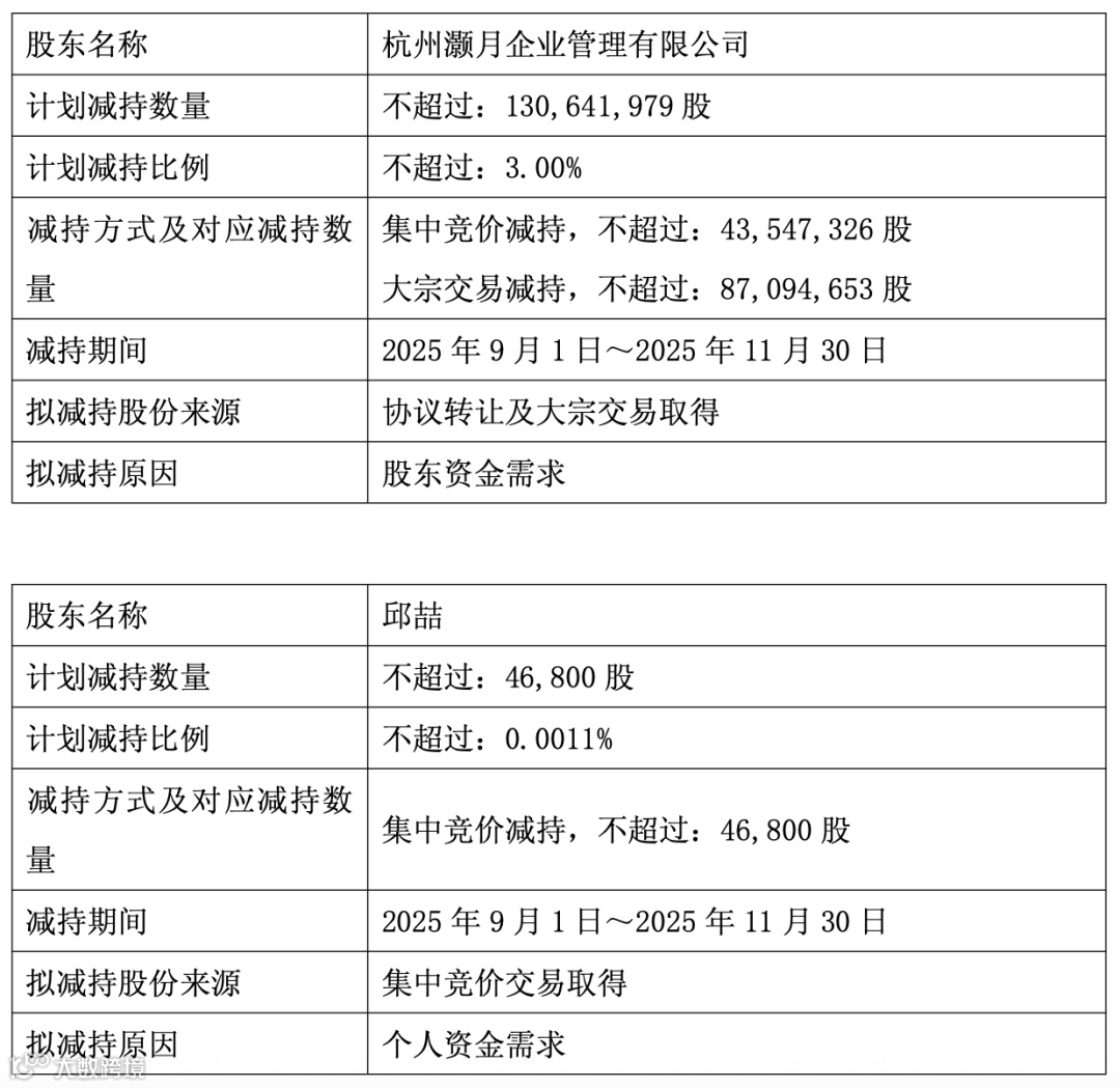 此次减持计划实施期为2025年9月1日至11月30日,其中集中竞价减持不超过43,547,326股(1%),大宗交易减持不超过87,094,653股(2%)[k]。