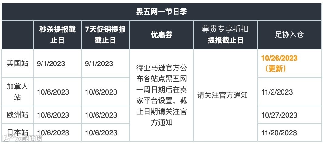 关注亚马逊各站点FBA入仓截止时间,美国站为2023年10月26日,加拿大站为11月2日,欧洲站为10月27日,日本站为11月20日,确保您的库存能在入仓截止日期之前及时送达仓库。
