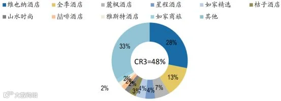 中端连锁酒店品牌 CR3达到 48%,CR5 为 56%:其中维也纳、全季大幅领先,市占率分别为 28%和13%。