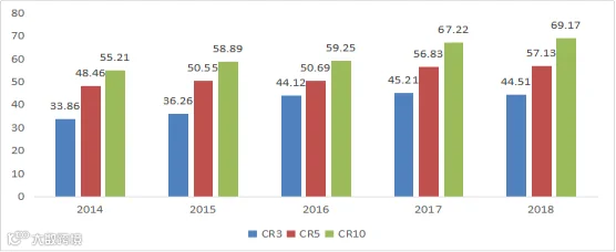 图4 2014-2018年中国酒店行业品牌市场集中度(%)