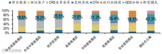 据艾瑞咨询提供的数据,我们可以得到①不同类型的酒店,营销渠道占比不同,但是直销渠道基本上都高于分销渠道;②酒店越高级,OTA渠道占比越低;③外资酒店的自有会员占比高,粘性高,我国除了经济型连锁酒店,其他类型的会员渠道占比较低。