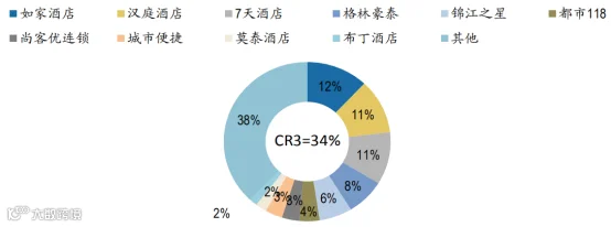 其中,经济型连锁酒店品牌 CR3 达到 34%,CR5 为 48%:如家、汉庭、7 天遥遥领先,锦江之星、格林豪泰紧随其后;