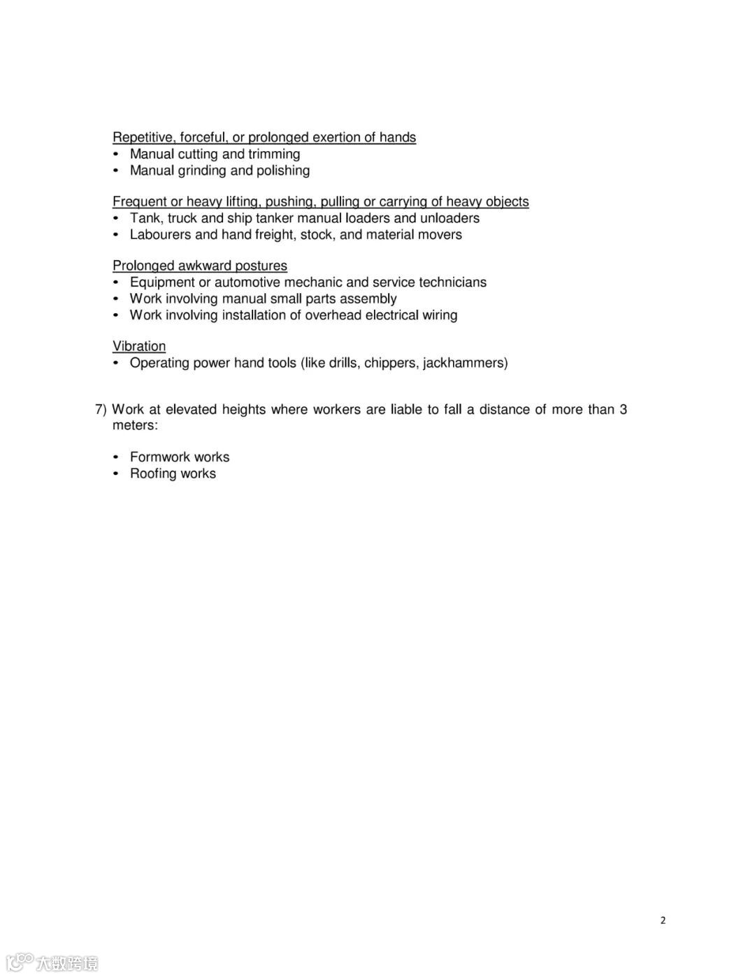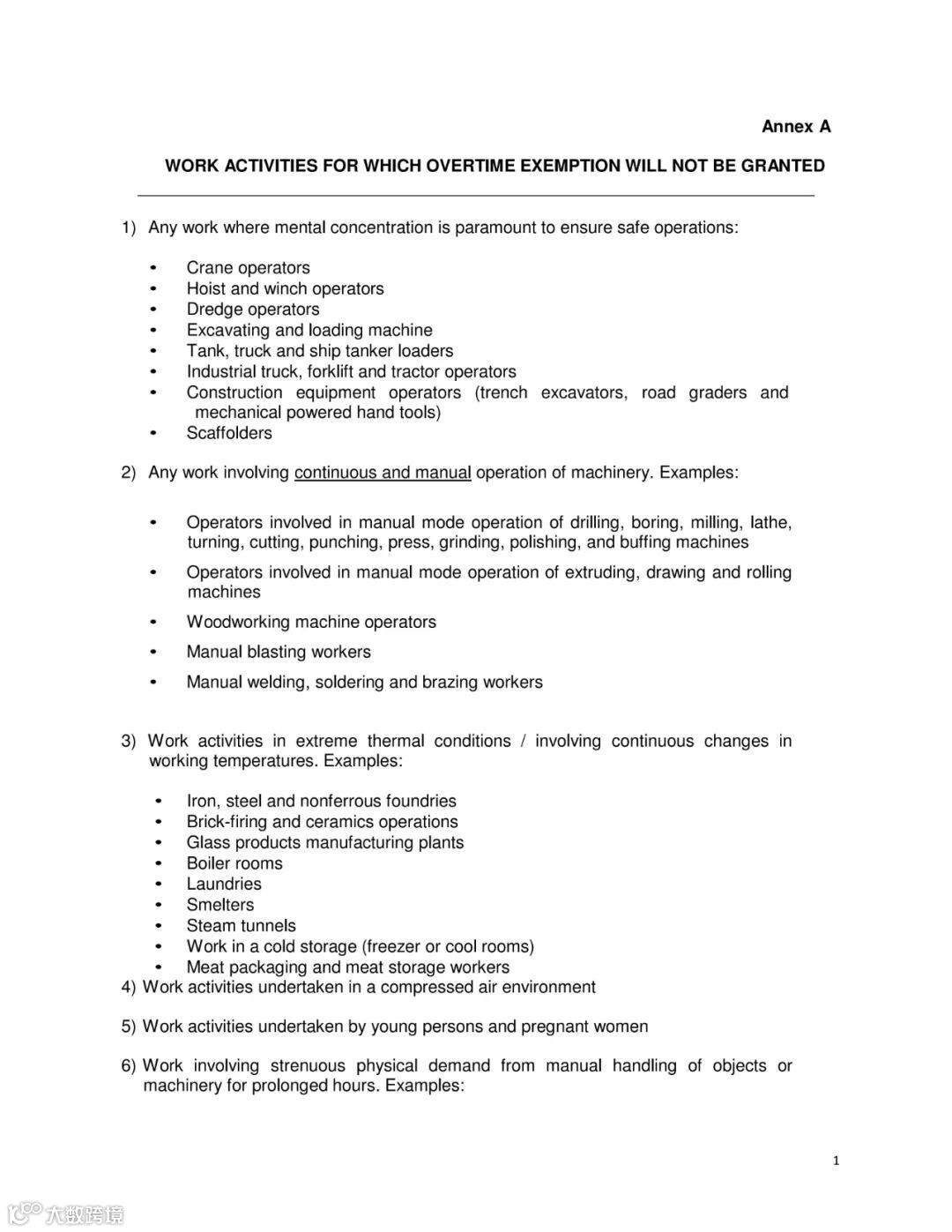 ● 从事《雇佣法令》第一附表中规定的工作,即: