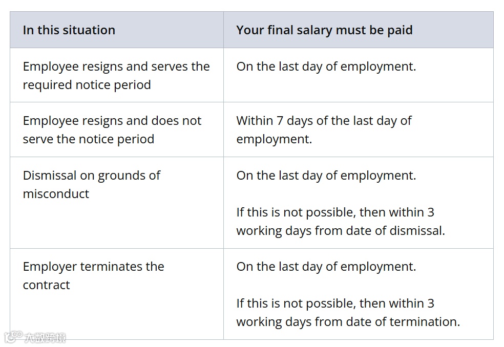 受《雇佣法令》保护的雇员,其雇主必须至少每月支付一次薪资。雇主也可选择更短的支付间隔。薪资必须在以下时间内支付: