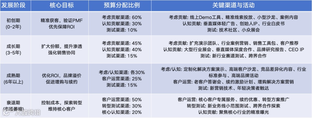 成熟期企业(比如头部ERP厂商):就需要优化投入产出比,重点布局品牌溢价与老客户增购;
