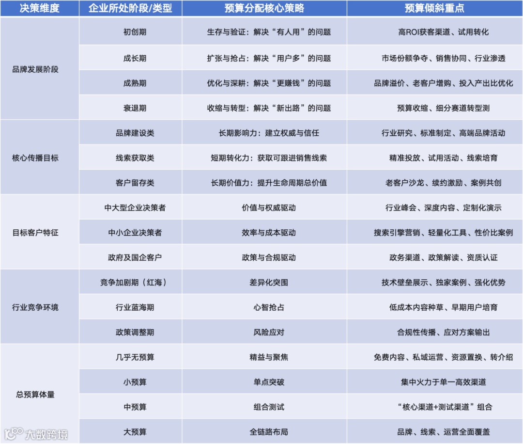 To B软件的预算分配需要围绕“品牌发展阶段”、“核心传播目标”、“目标客户特征”、“行业竞争环境”、“总体预算体量”这五大核心变量展开。脱离企业实际场景地去套用标准化公式,只会导致预算浪费或战略失焦。