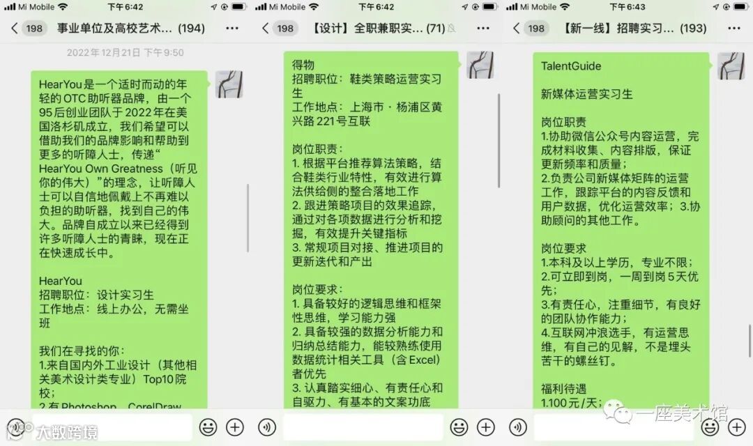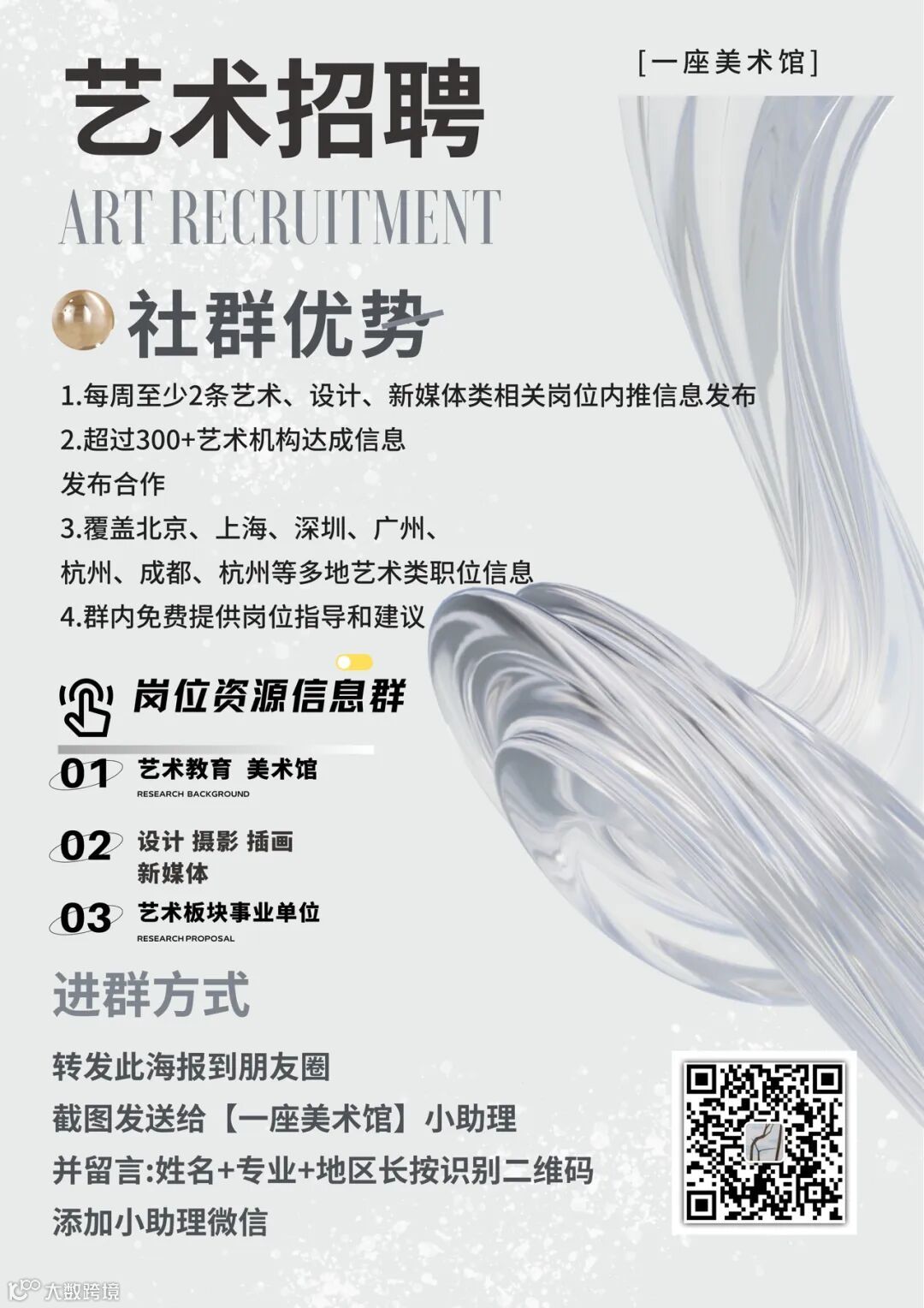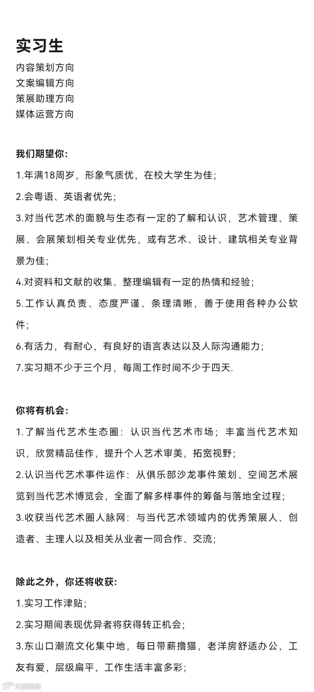 招聘岗位:艺术总监/策展人 | 主理人助理 | 艺术品销售顾问 | 新媒体运营专员 | 艺术编导运营专员 | 品牌宣传/活动策划运营专员 | 实习生