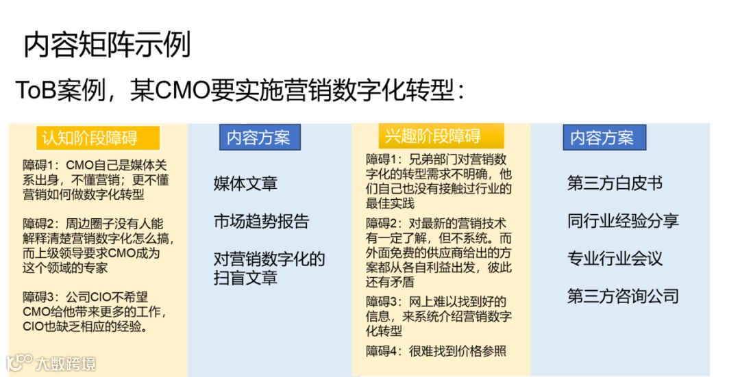 下图介绍了类似刚才的案例中,客户在两个阶段所遇到的信息障碍,以及我们要准备的营销内容矩阵示例。