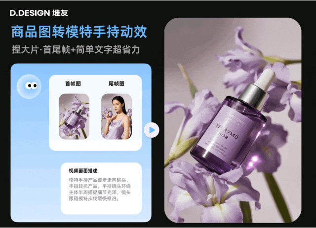 如何拍出这种棚拍级别的商业广告展示短片?小堆直接帮你!在AI反应堆上传产品图,选择中文全能海报直出pro模型,简单输入咒语就能拥有手持模特图。上传首尾帧图片,静态产品图到模特手持视频展示,轻松拿捏!