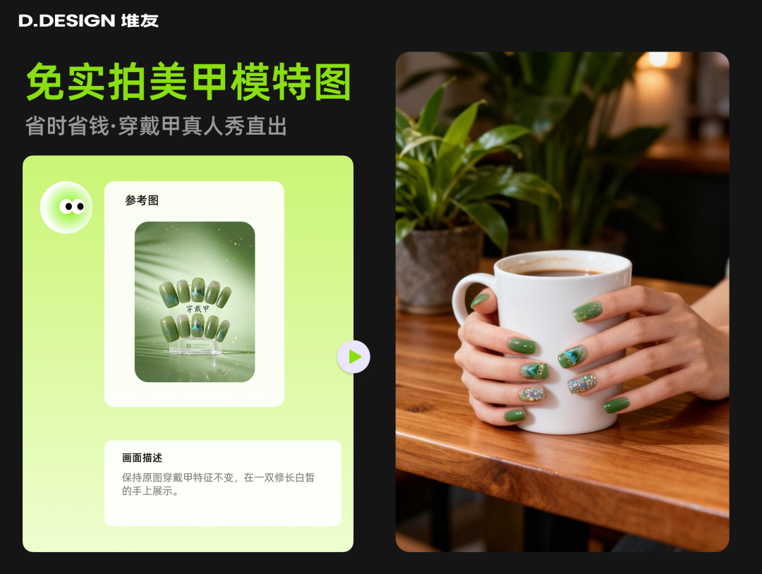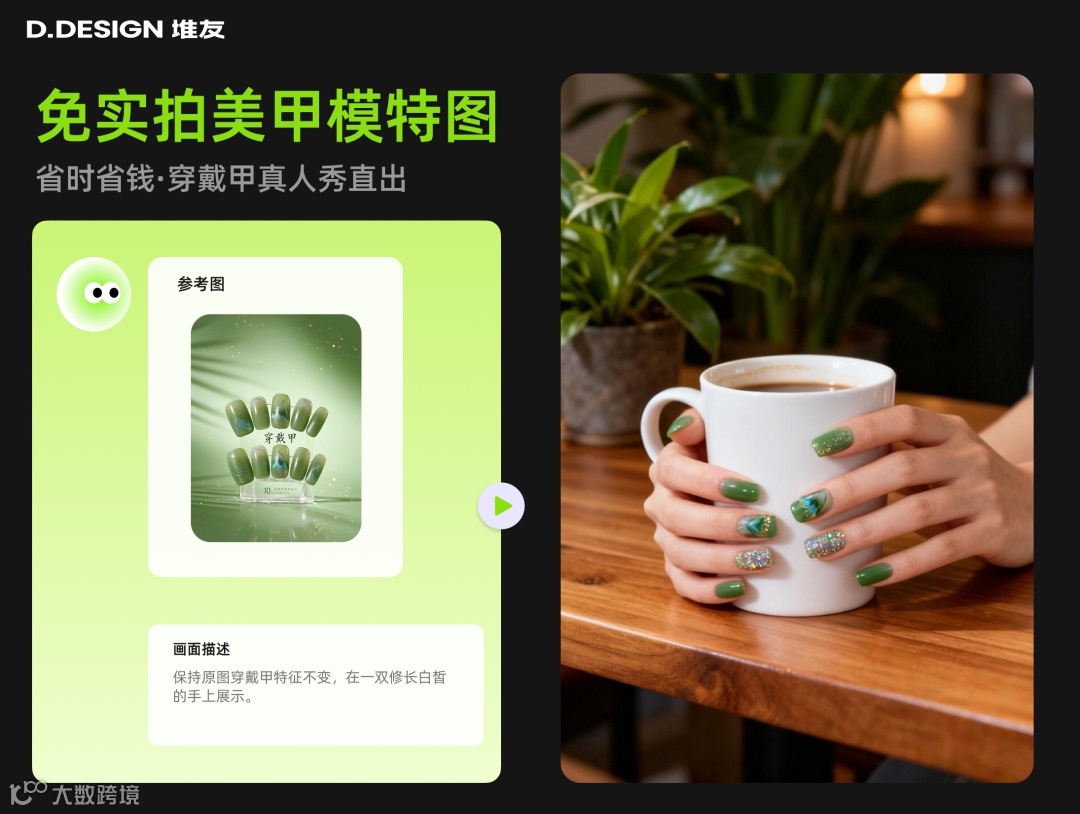 好看的手模不好找,好用的AI来帮忙。上传美甲甲片图,输入咒语即可快速获得精致手模“实拍图“。再也不用担心崩图了,修长白皙的纤纤玉手任你调用,想戴哪款戴哪款~💅