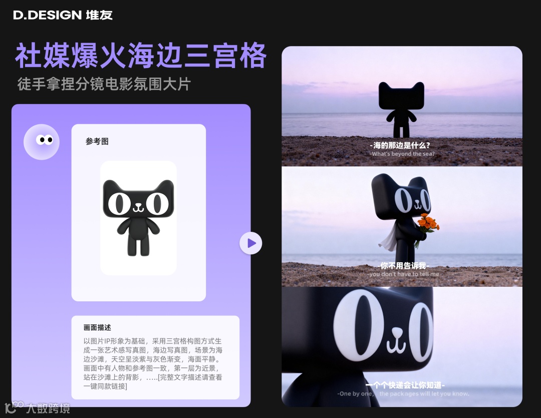 精准控制图中的中英文台词文字,多角度展示主角破碎感,这就是社媒近期爆火的“海的那边”系列。一张原图就能让任意形象拍出故事性极强的梗图,记得来堆友试试。