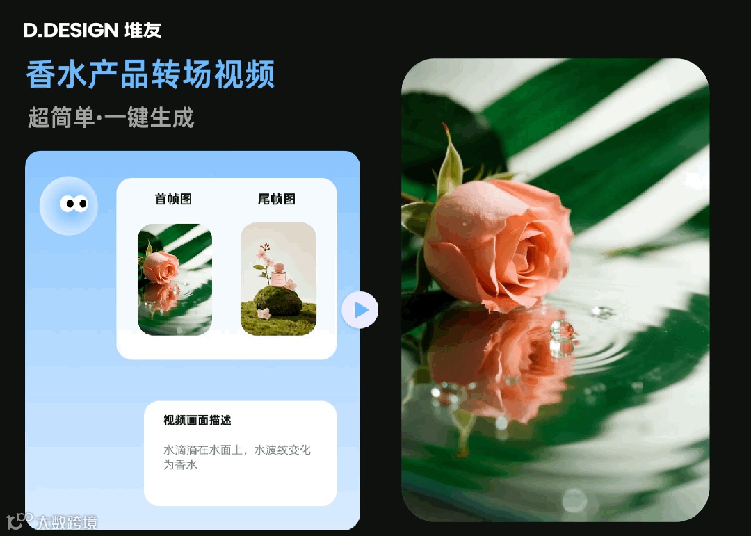 5秒钟的转场视频,200块的香水马上进化成了2000块的价值感,收割一大票视觉系动物的喜好!花香从屏幕溢出,用眼睛让顾客试闻,堆友图生视频分分钟帮你的产品销量“更上一层楼”!