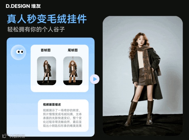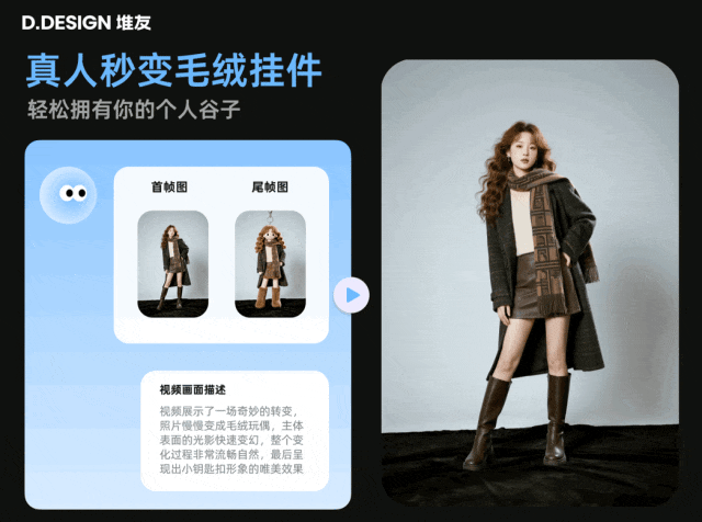 能拥有一个自己形象的钥匙扣,还是冬天毛绒应急款,不要太酷了!上传你的全身照,堆友首尾帧视频就能帮你破次元,让朋友圈的亲友见识一下“你的专属IP谷子”的厉害吧~
