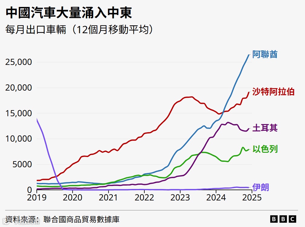 在中东各地城市,国产品牌汽车越来越常见。出口数据显示,2024年对该地区汽车出口量已达到每年逾100万辆,是2019年约15万辆的六倍之多。海湾国家,SUV(运动型多功能车款)和小型卡车长期以来因实用和多功能而备受青睐。几十年来,路虎卫士(Land Rover Defender)、日产途乐(Nissan Patrol)等更几乎成为标志性车型。