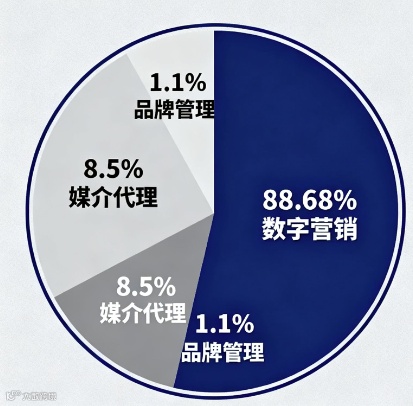 行业领跑者的硬核成绩单:2024 年以 206.4 亿元年度承揽额连续四年稳居本土第一,市场份额扩大至 3.8%;2025 年上半年数字营销收入占比高达 88.68%,位居本土代理公司前列。