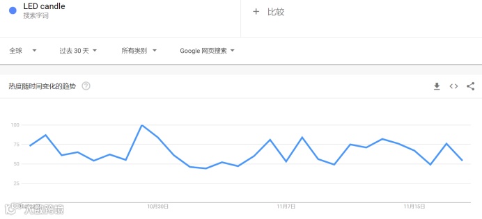 根据Google Trends数据显示,搜索“LED candle”近30天热度趋势,全球对于“LED candle”的搜索热度保持在50以上,甚至到100,伴随着海外节日到来,这一热度趋于持续上升。