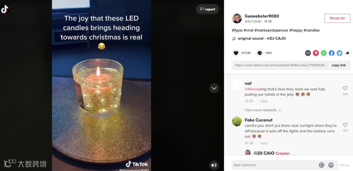 10月18日,一名昵称为“lisawebster9080”的网友在TikTok上发布了一条关于LED蜡烛灯的视频而走红,该视频为这位海外网友点燃蜡烛灯芯,并使周边其他小灯也瞬间亮起来的视频,没有添加任何音乐和技术剪辑,视频上配的文字为“圣诞节来临之际,LED 蜡烛所带来的愉悦是如此的真实”。
