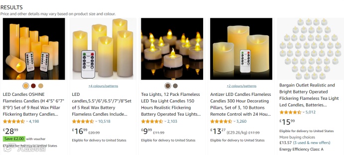 根据亚马逊,英国站平台搜索结果可知,目前售卖较好的LED蜡烛灯皆为简单款蜡烛灯。整体为白色的柱状蜡烛造型,并配置LED开关,随时开关或调节灯光亮度,售卖价格在9.99英镑—30英镑之间。