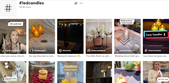 随着社交媒体在人们生活中越来越重要,人们乐于在各大社交平台上分享好物。近日,LED蜡烛灯在TikTok上热度直线上升,“#led candles”话题的观看量达741.6K。这些视频中有分享各种LED蜡烛开箱,有各种造型蜡烛分享视频、有用来装饰后分享家庭布置的、有趣LED蜡烛灯的分享视频等。