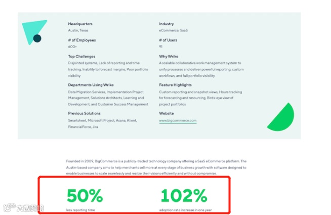 这些信息可以让潜在客户对案例重点有一个把握,同时也实现了对案例所述客户品牌的推广,并利用客户品牌为自身品牌进行了背书。