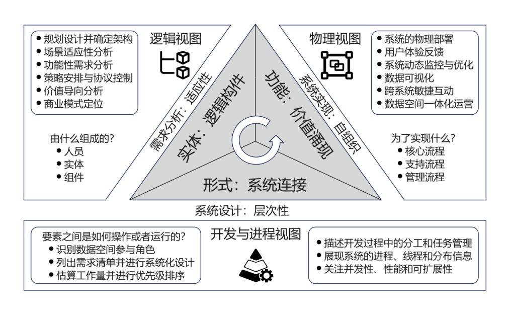 数据空间的开发遵循一条结构严谨、环环相扣的实施路径,这条路线将抽象的系统概念转化为具体的工程实践。开发过程始于对系统本质的深刻理解,即把握实体、形式与功能三大核心要件。实体作为系统的基本构成单元,涵盖了参与者、数据资源、软硬件组件等要素;形式则通过系统架构与连接机制,刻画实体之间的静态关系与动态交互;功能则强调通过组件协同所涌现的复合价值,体现为数据流通、可信管控与价值共创的能力。三者结合使这条路线具有层次分明、迭代递进的节奏。