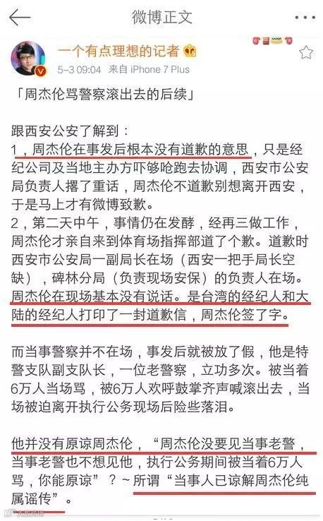 据微博@一个有点理想的记者披露,事件发生后,周杰伦本人最初并无道歉意愿,其经纪团队及主办方紧急协调。西安市公安局相关负责人明确表示“周杰伦不道歉别想离开西安”,随后周杰伦发布微博致歉[k]。