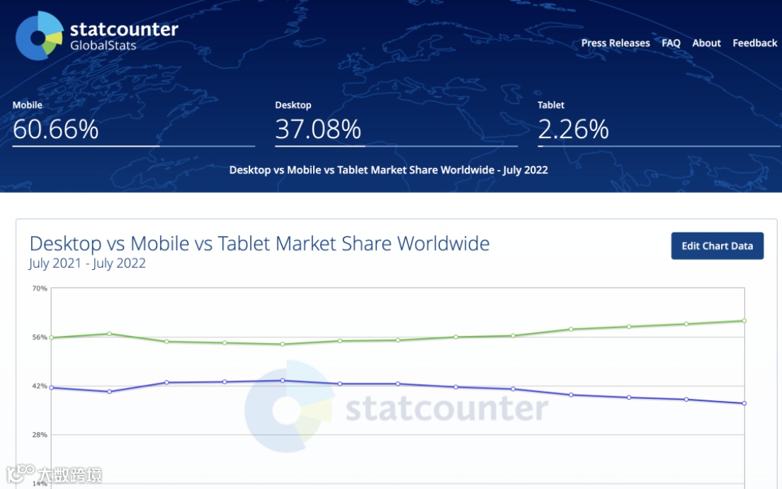 从图中可以看到,2021-2022年,移动端的浏览量已经超过了60%,PC端37%,平板端不到3%。