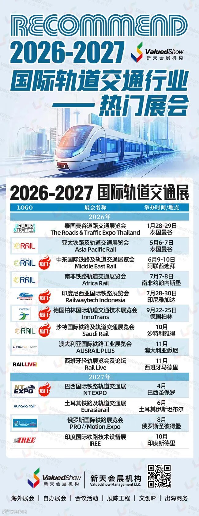 2026-2027年国际轨道交通行业热门展会清单来啦!从泰国曼谷到德国柏林,从南非约翰内斯堡到巴西圣保罗,覆盖亚、欧、非、澳、南美洲!想紧跟行业动态、拓展海外市场,这些展会别错过,扫码了解详情,和新天会展一起奔赴全球轨道交通盛宴!