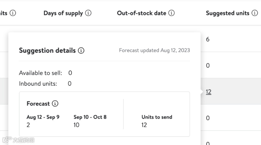 查看有关如何计算您发送到 WFS 的单位的更多信息,请选择建议的单位数量以打开建议详细信息。您将看到可售商品数量的详细信息、当前入库到 WFS 的该商品的商品数量、未来 1-4 周和 5-8 周(按日期)的预测商品销量以及待售商品的商品数量。发送给我们根据这些数字计算的结果。