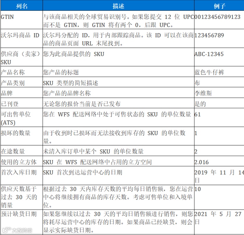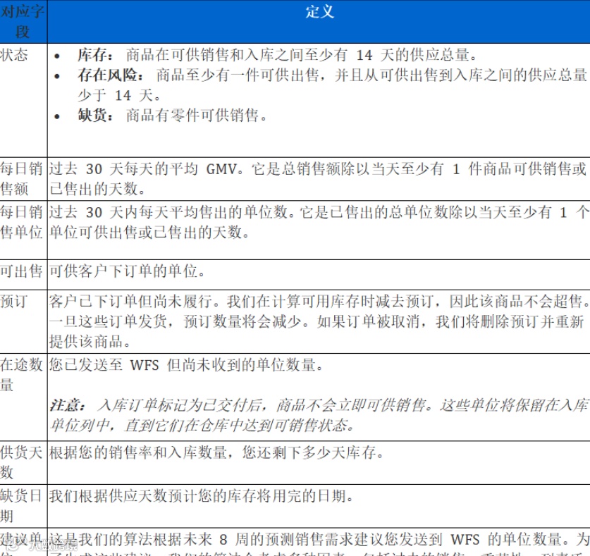 库存状况报告为您提供当前 WFS 库存的列表、状态和数量信息,以及 SKU 级别过去 7 天和 30 天的表现。下表提供了报告中每一列的详细说明: