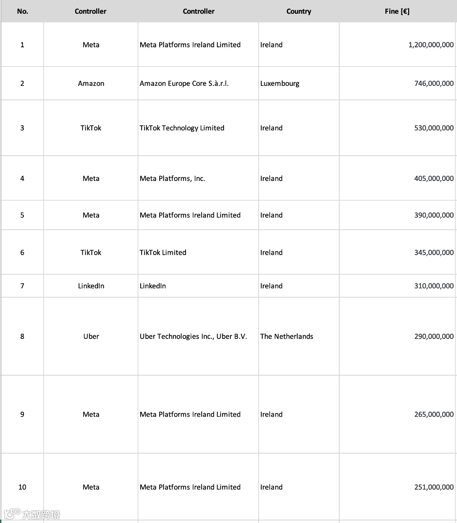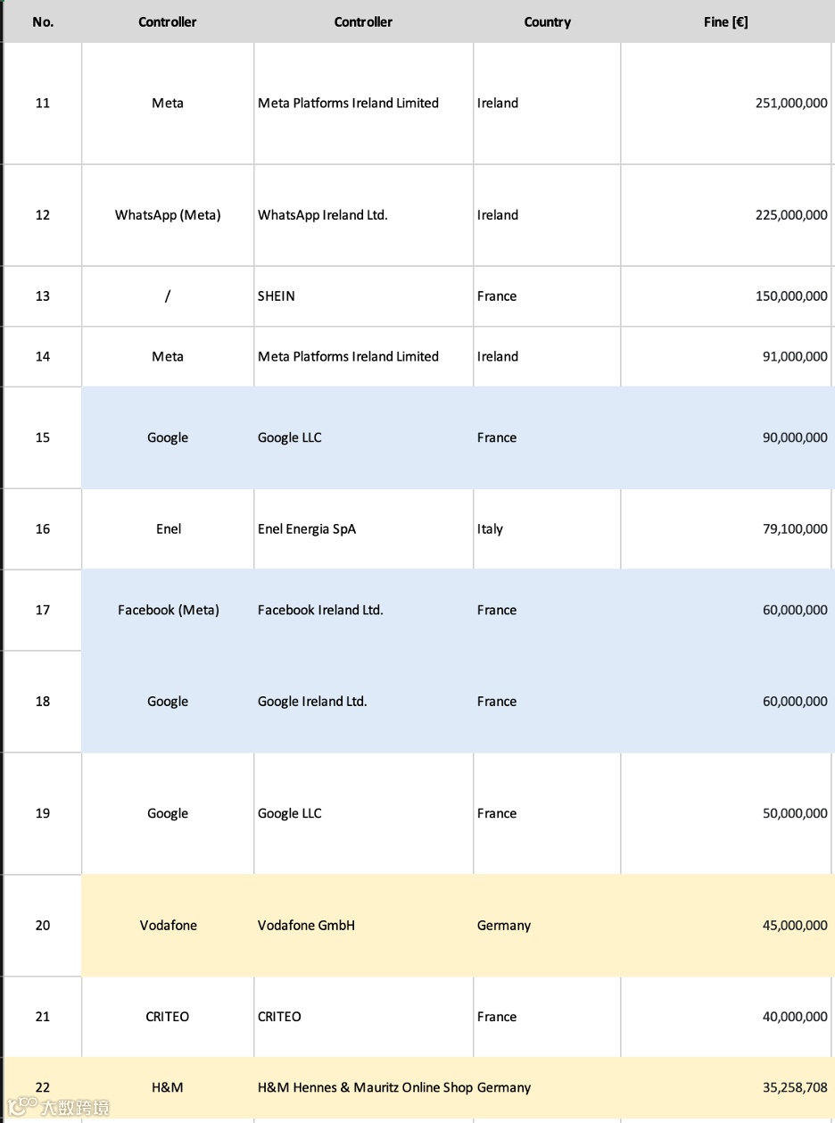另外需要说明一下,这个小研究项目拖延了好几个月,导致Top 10发生了变化。2025年法国CNIL对谷歌处罚3.25亿,跻身前10。为了便于分析,这里还是基于该处罚之前的格局(见下)。