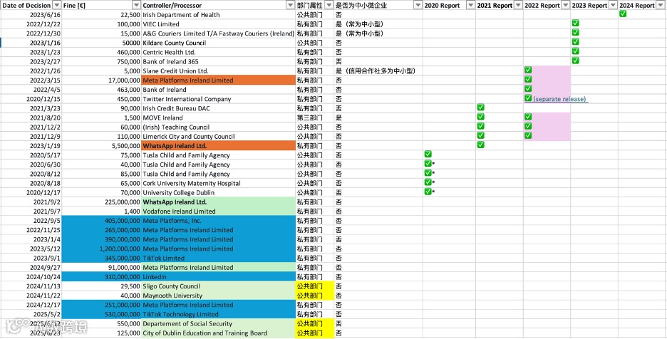 下面这半边的特征很明显,绝大多数都是能叫得上名字的互联网大厂,除了上述Top10提到的之外还有沃达丰和LinkedIn,剩下四个叫不出名字的都是爱尔兰本土的公共机构(已经标黄),而这四项罚金之所以还没有确认是因为最早的一项罚金作出时间为2024年11月,距今还不满一年。