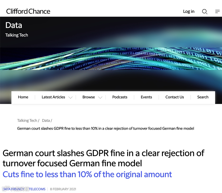 最终罚款金额多少还会受到法官的重新评估。例如, 1&1 AG公司因身份核验措施不足,导致第三方获取用户手机号,被控违反GDPR第32条而被监管机关罚款900万欧元。2021年,德国法院作出决议,否定了以公司营业额为核心的GDPR罚款计算模式,最终将900万罚金降低到90万欧元,直接减少了一个零。