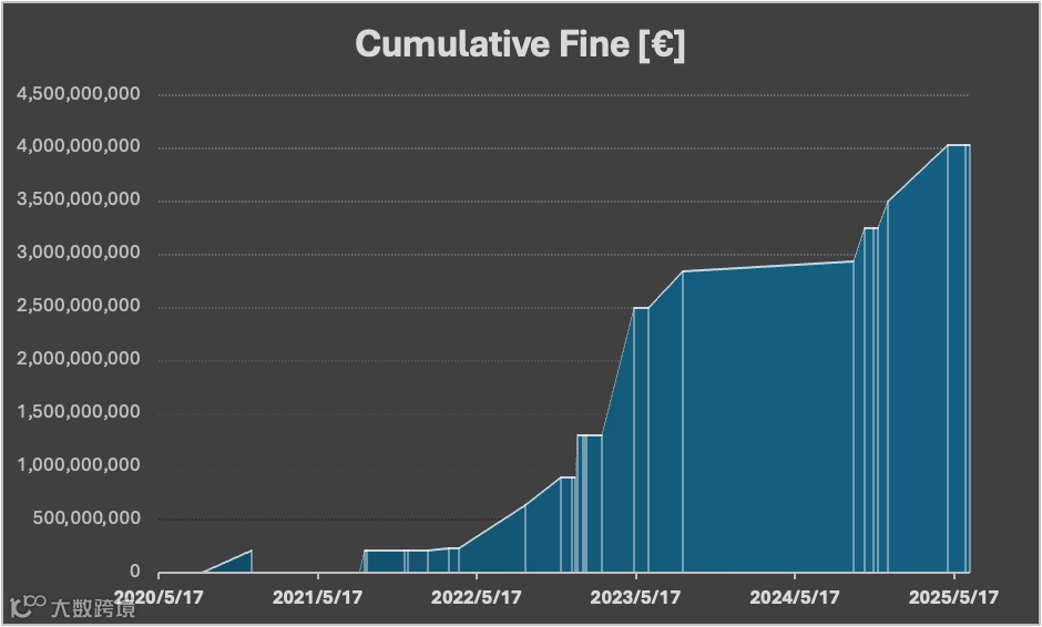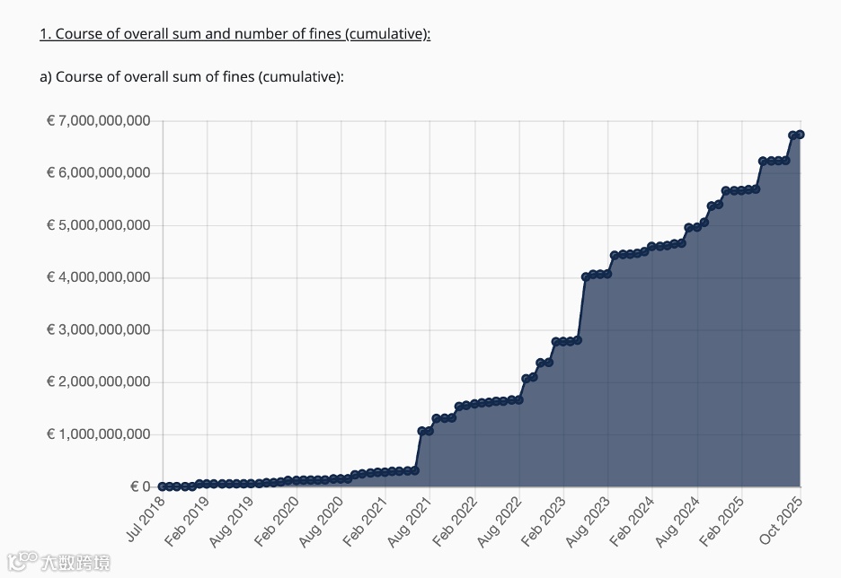 根据CMS的GDPR Enforcement Tracker提供的数据,截至2025年10月,GDPR处罚总金额已经突破57亿欧元大关。