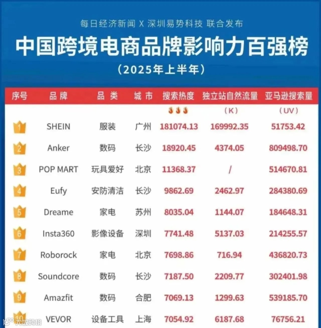 近日,《中国跨境电商品牌影响力百强榜(2025上半年)》正式发布。