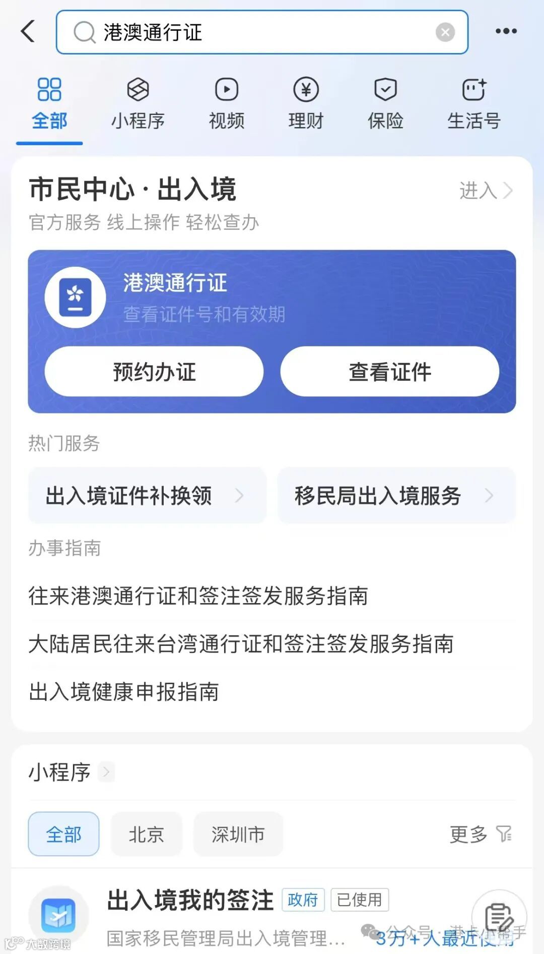 2.找到市民中心,出入境,港澳通行证,查看证件,登入国家移民局政务服务平台