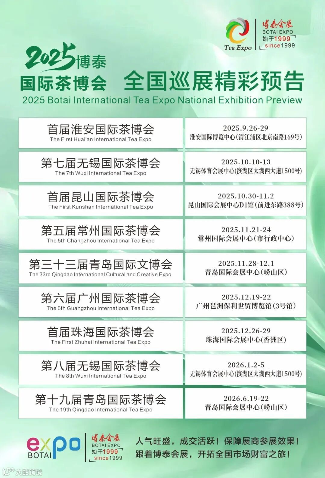淮安国际茶博会由博泰会展集团精心打造。集团深耕会展行业26年,积累了丰富的经验,曾成功操盘多届大型展会,树立了良好口碑。凭借强大的资源整合能力和专业团队,博泰为参展企业提供全方位、一站式服务,确保展会顺利进行。