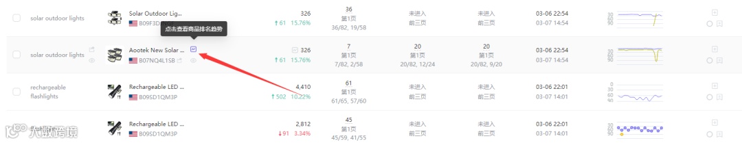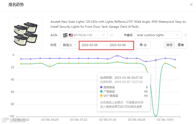 查看每一个关键词在不同时间段的搜索位置,并选定该关键词在某一天的表现,通过分时趋势的广告表现,我们可以判断出该关键词在不同时段的自然排名和广告排名;