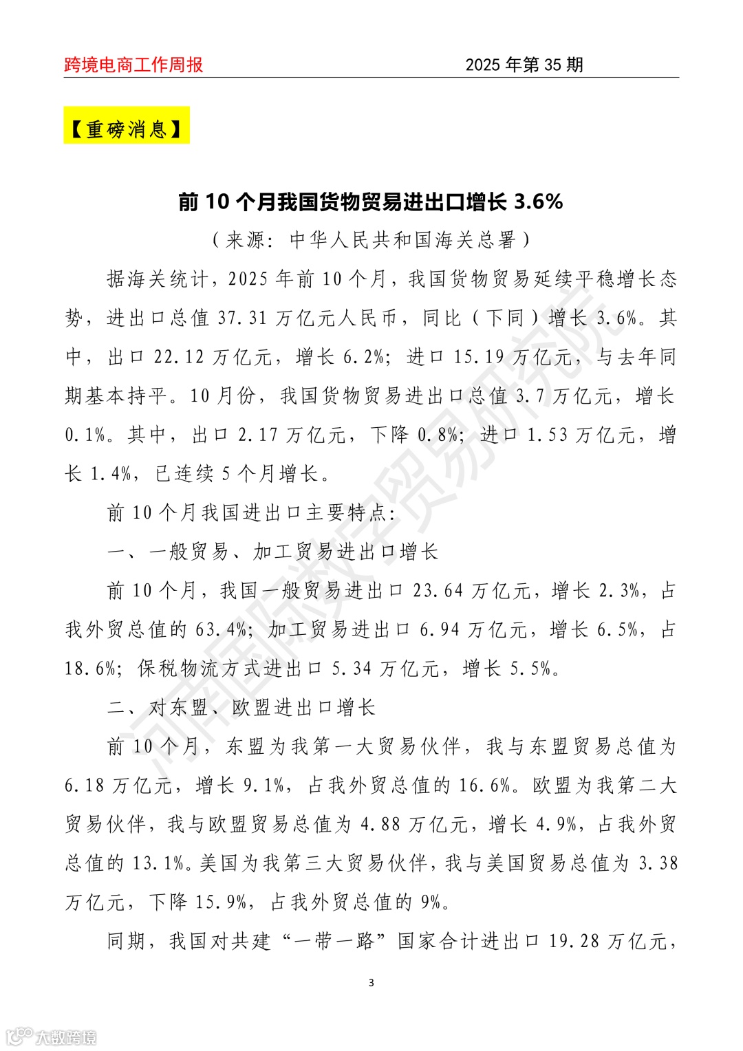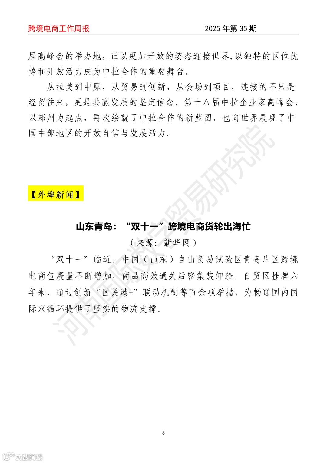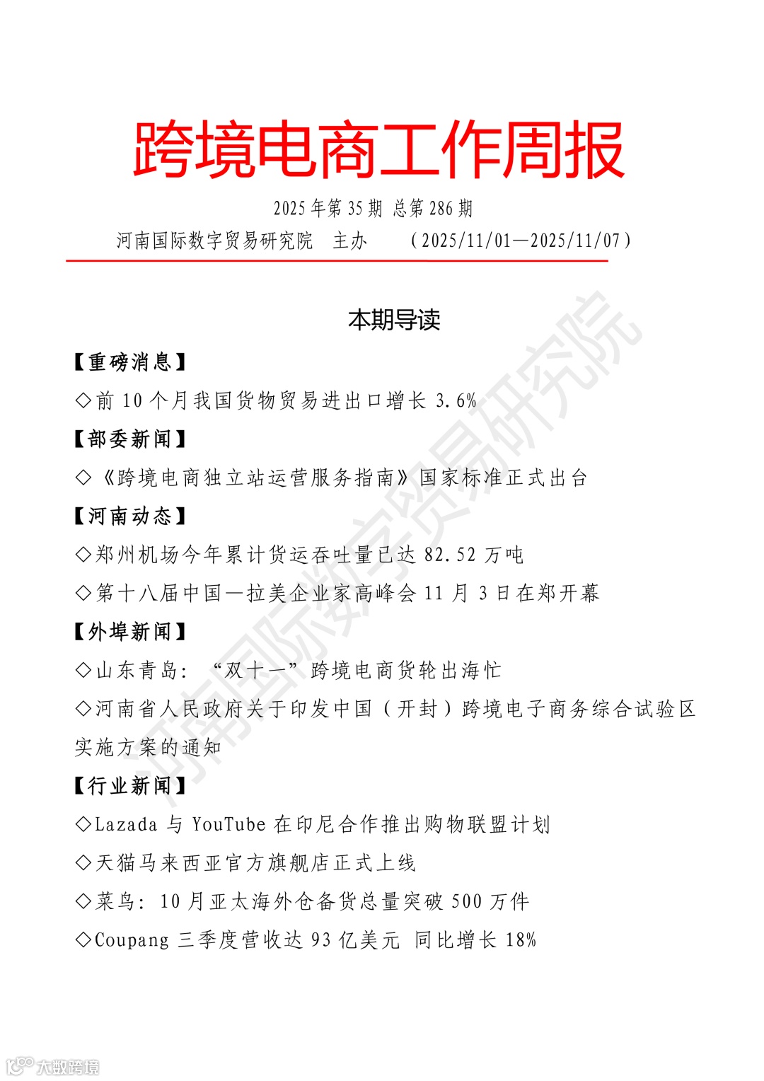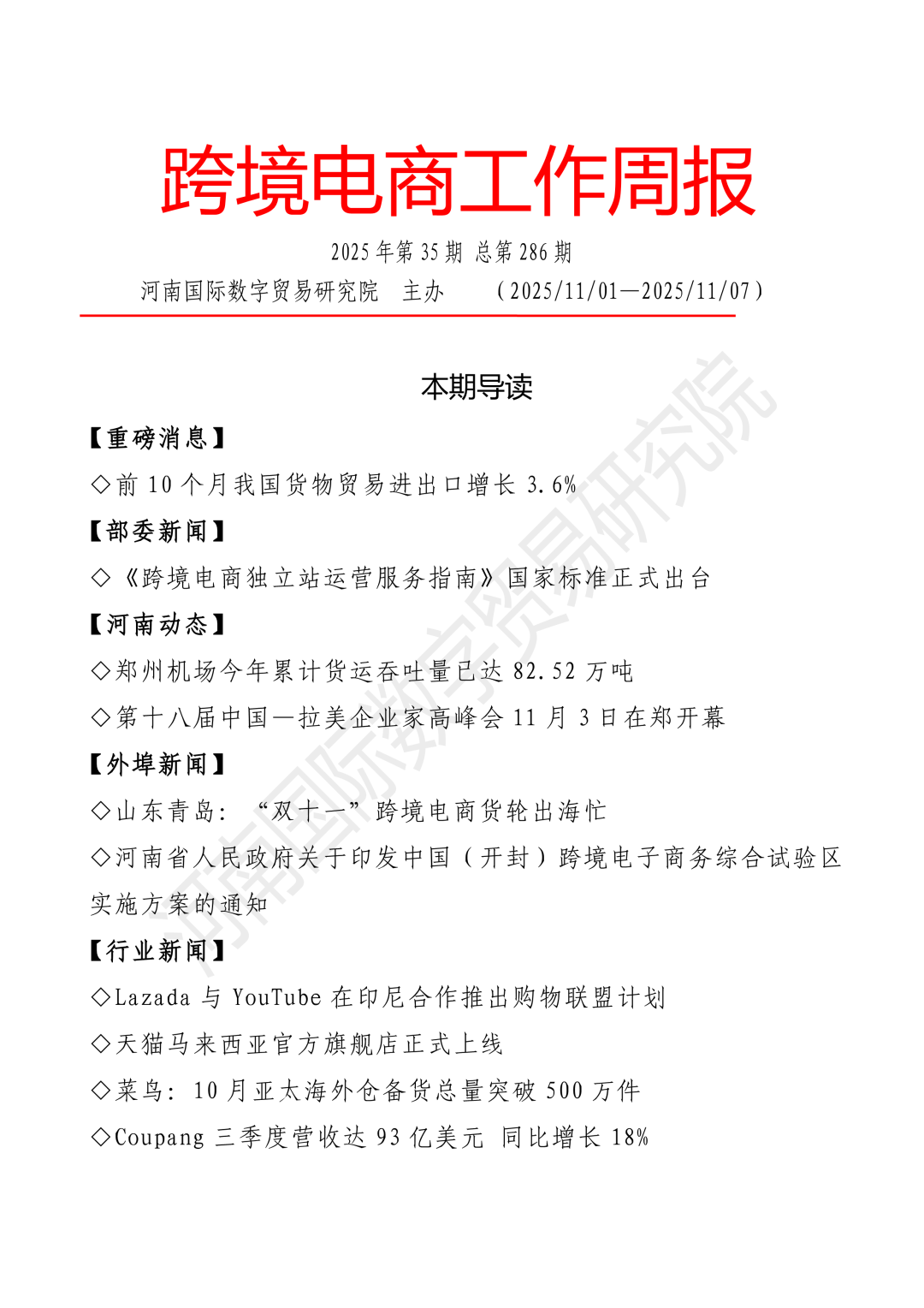 2025年第35期(2025/11/01—2025/11/07),跨境电商领域又发生了哪些事件,以下是河南国际数字贸易研究院为大家带来的本周外贸进出口、跨境电商平台、服务商及各地跨境电商最新动态回顾。