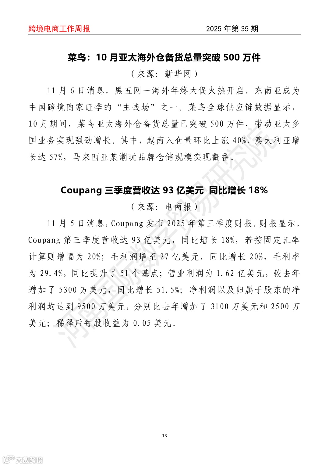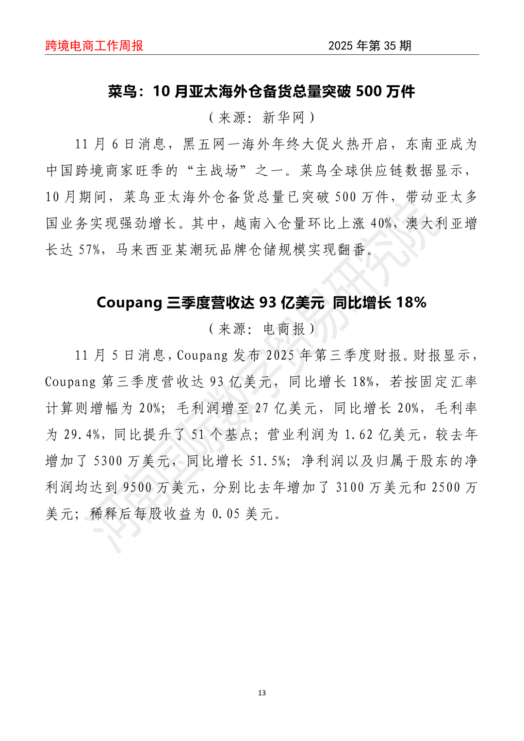 跨境行业活跃。《跨境电商独立站运营服务指南》国家标准正式出台。第十八届中国—拉美企业家高峰会11月3日在郑开幕。Lazada与YouTube在印尼合作推出购物联盟计划。天猫马来西亚官方旗舰店正式上线。菜鸟:10月亚太海外仓备货总量突破500万件。Coupang三季度营收达93亿美元,同比增长18%。Shopify第三季度GMV达920亿美元,同比增长32%。亚马逊墨西哥推出快速配送服务Amazon Now。亚马逊印度跨境电商出口突破200亿美元。
